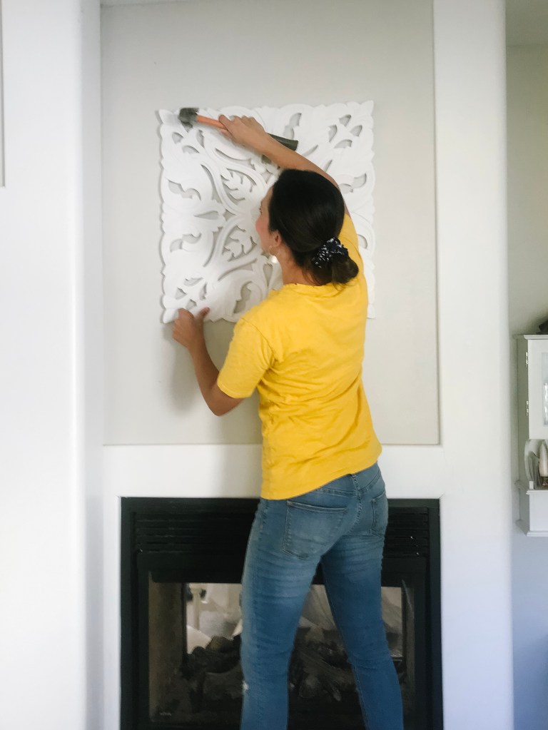 Sure enough, as we stepped back to inspect, we could see that it sat slightly slanted. Instead of poke another hole in the wall, in the same spirit of winging it, I next suggested we just stick something on top of the left nail so it would sit a hair higher…something like a piece of cotton ball! I quickly grabbed one out of a nearby drawer and climbed on top of the fireplace to place it. But it wasn’t enough, so I started stuffing more and more cotton on top of the nail until the darn thing hung straight. Mission accomplished?