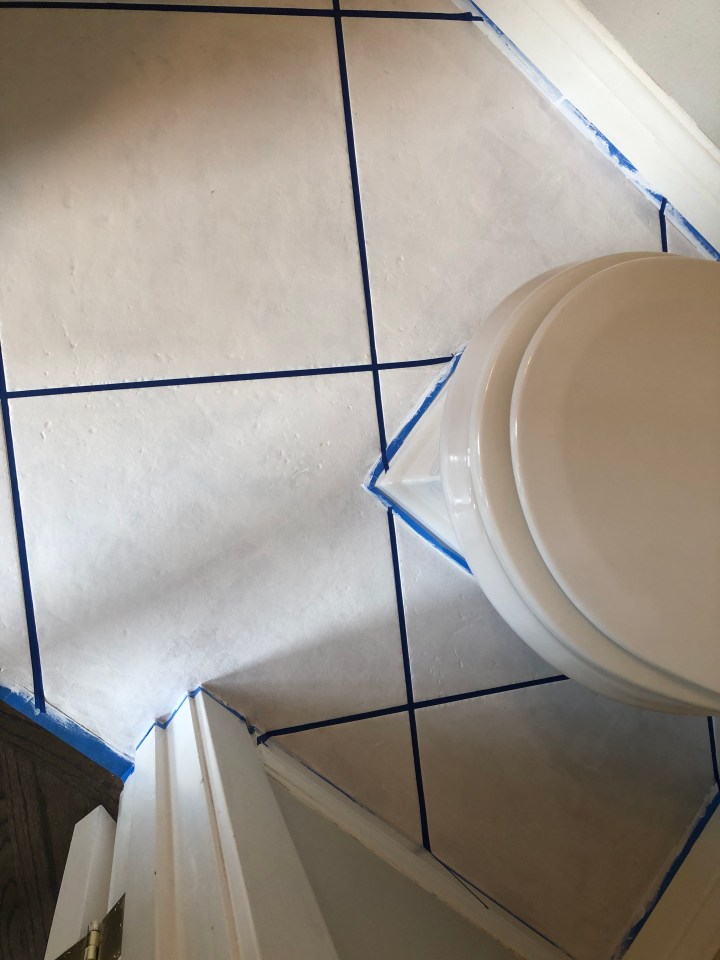 2. Tape off the baseboards, toilet and sink area and put several coats of 1-2-3 Bull’s Eye Zinnser Primer on the the tile and grout. I applied the paint with a roller for most of it and used a paintbrush around the edges of the room and the tiles themselves.