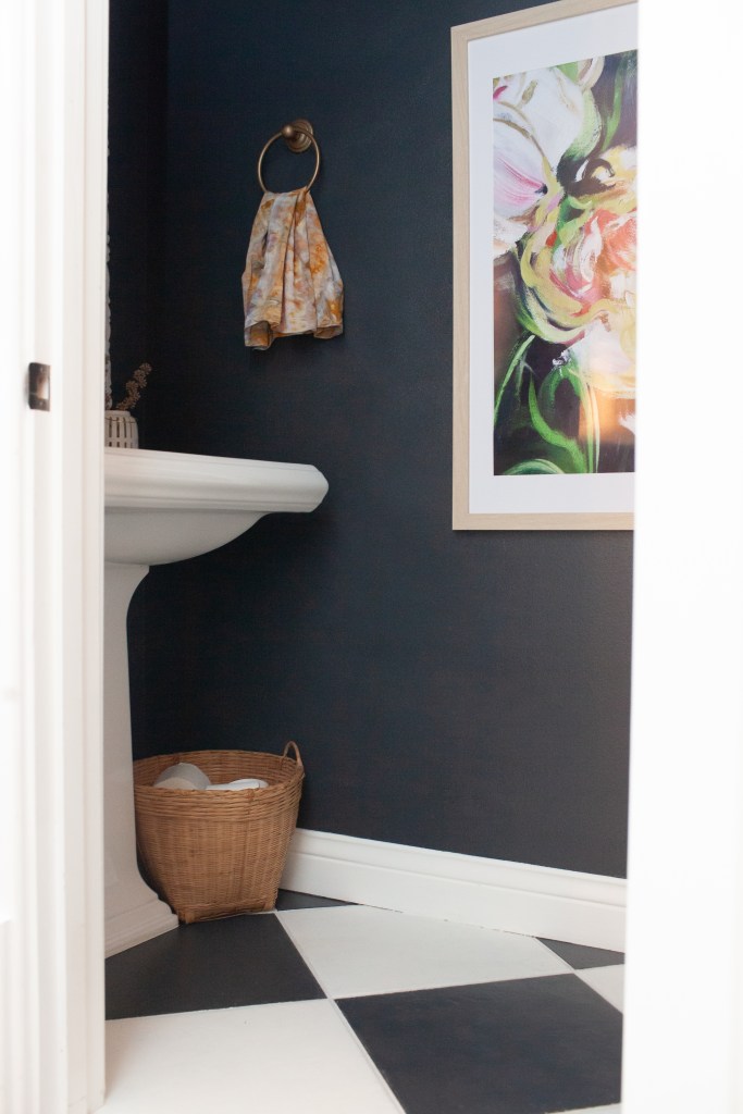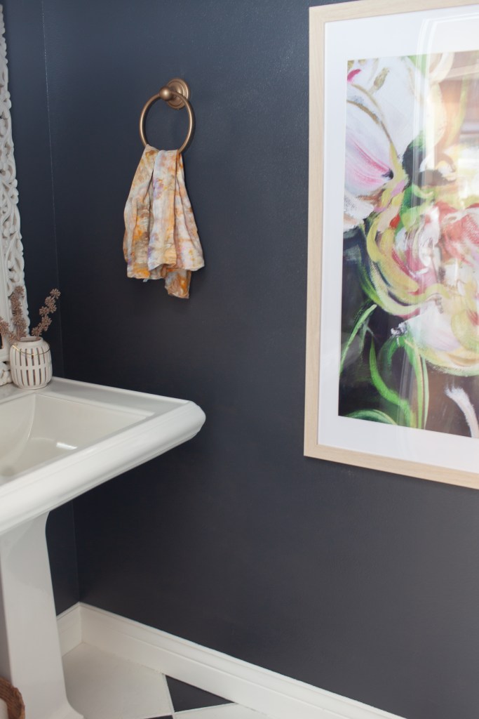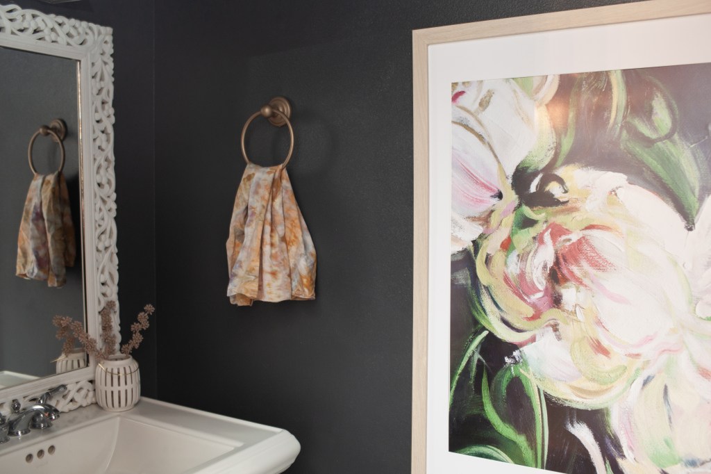 There was only one problem. From the outside of the bathroom peering in, the room looked like a big black hole, so I hung and oversized floral painting right in the middle of the open wall. The light oak wood framing the floral print really broke up all the black and warmed things up in there.