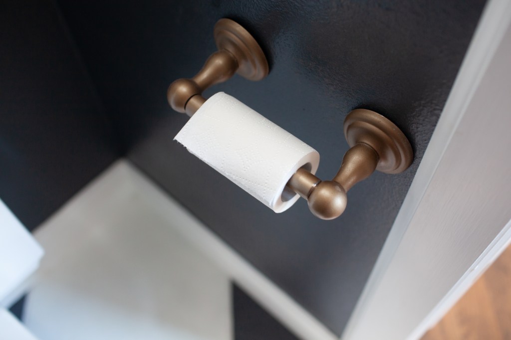 Also, the transformation on the floors inspired me so much, I couldn’t stop there. I went on to paint the walls of the entire bathroom that same Black Ink color by Benjamin Moore. I also dug up some old floating shelves from Ikea that I had stored away for a moment like this and painted them that same black, too. I hung them over the toilet for a floating shelf look. I also took down the light fixtures and toilet paper holder and spray-painted them with “Rust-oleum Metallic Paint and Primer in One” in the Satin Bronze color. The gold accents against all the black elevated the look of the bathroom even more.