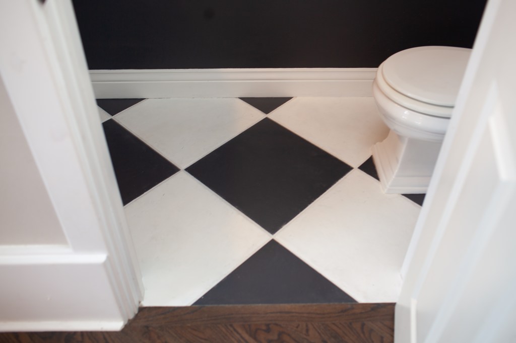 First things first, I was inspired by the stone checkerboard floors in Chris Loves Julia’s dining room. I’ve scrutinized and have considered painting (and perhaps stenciling a pattern) onto the large blah-brown tiles in our powder bath for many years, but it was our floor’s potential to look good in a diamond checkered pattern that gave me the push I needed to take the risk and paint them. And, of course, I took this risk to a whole new level when I disregarded any tutorials calling for a specialized type of tile paint. Instead, I used leftover black and white Benjamin Moore Advance paint I had laying around. I decided that if I was priming the tile anyway, it didn’t matter what type of paint I chose to use, and spoiler alert, it’s been four months since I finished this project, and I pretty much feel the same way!
