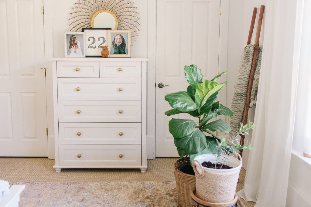 Some other things I love about their room are the dresser knobs, which used to be white, that I spray painted. I’m also very proud of the plants in there! There’s a fiddle leaf fig I rescued from its deathbed and a baby olive tree I just got. Both are thriving because of all the sunshine my girls get, and because I’m such a devoted plant mama. My girls often tease me because I’m always checking on them (the plants) and telling them (my girls) how the plants are doing. “You love them more than us!” they joke. Anybody else love their plant babies a whole lot?